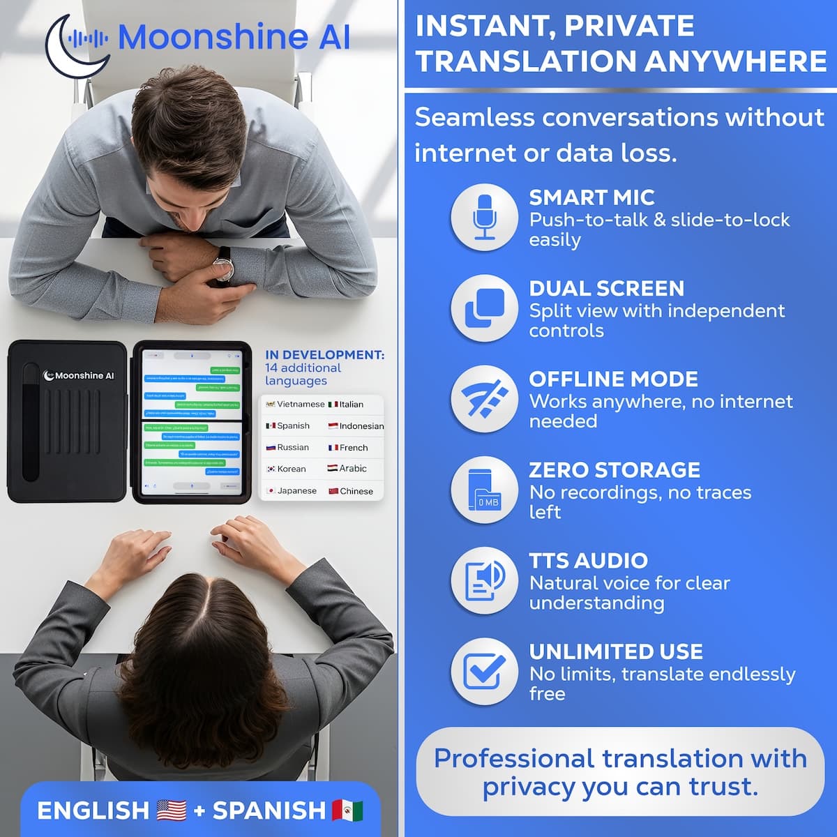 Moonshine does everything locally on the device, with no internet connection. This means all student conversations are literally kept in your hands, which ensures full FERPA compliance. It also means you can use it anywhere in the world, as easily as you can in your classroom, for everything from PTA meetings to field trips or even international exchange programs.