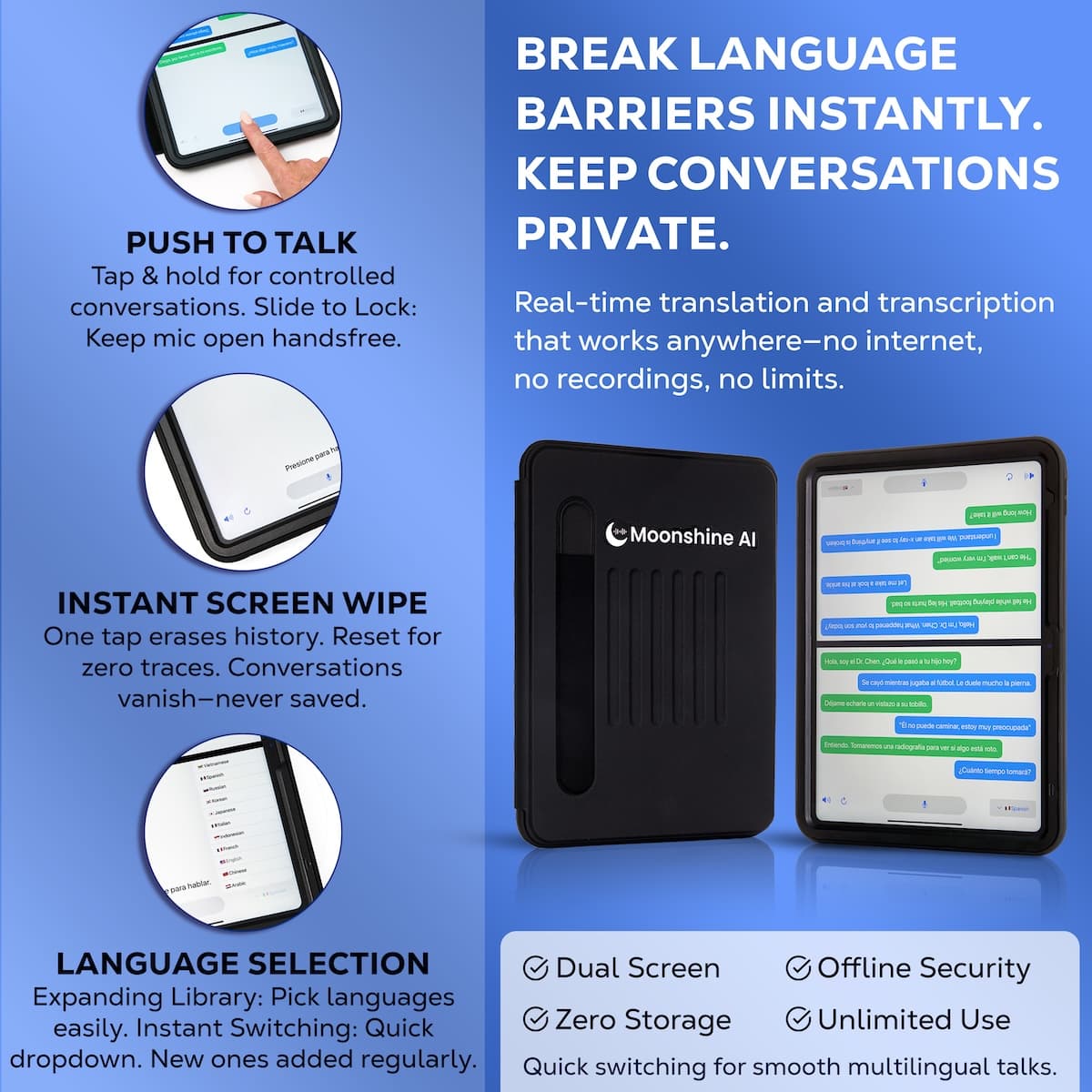 Moonshine does everything locally on the device, with no internet connection. This means all student conversations are literally kept in your hands, which ensures full FERPA compliance. It also means you can use it anywhere in the world, as easily as you can in your classroom, for everything from PTA meetings to field trips or even international exchange programs.